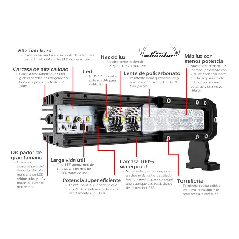 Estas barras led cuentan con una lente de policarbonato prácticamente irrompible y 100% transparente, que no amarillea ni pierde transparencia con el tiempo. Tanto la carcasa como los soportes son fabricados en aluminio 6063 de alta calidad y acabado en pintura epoxy negra, resistente a las abrasiones y a los rayos UV.