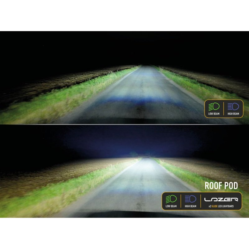 El kit Lazer Roof Pod es la solución de referencia para la nueva generación de Ford Ranger y Volkswagen Amarok. Este módulo completo integra dos barras LED Glide de alto rendimiento, con una potencia bruta de 23 000 lúmenes para una visibilidad excepcional de hasta 1549 metros.