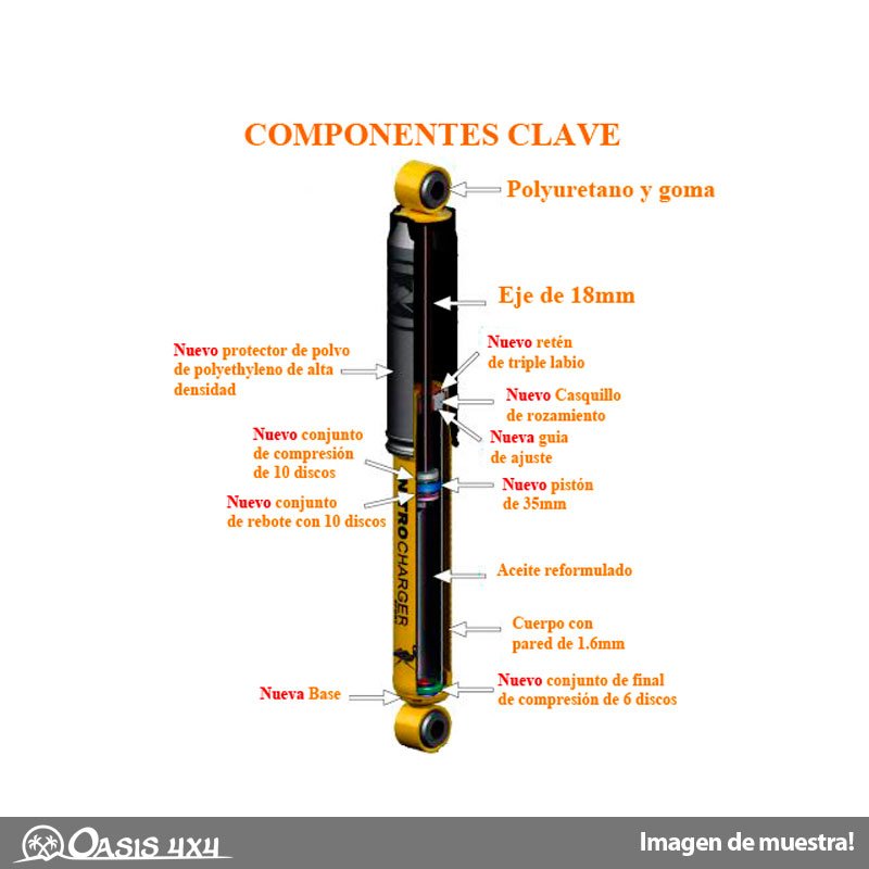 El amortiguador Nitrocharger Sport de OldManEmu para Isuzu DMAX / Rodeo aporta un 35% de dureza extra respecto a su predecesor, consiguiendo de este modo un amortiguador con un comportamiento excelente tanto fuera como dentro del asfalto. Su ajuste, específico para cada modelo de coche, ha sido estudiado concienzudamente por los ingenieros de OME durante largos test en los variados terrenos Australianos.
